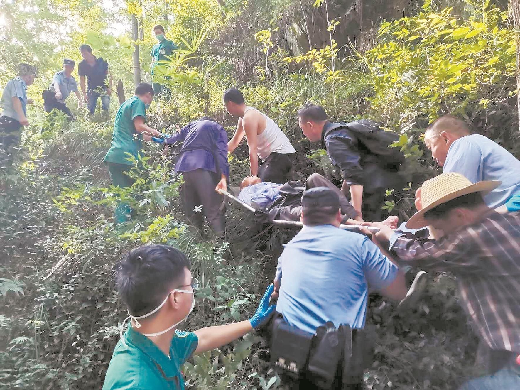 派出所所长刘晓东、教导员王泰敏带领两名辅警直奔现场,同时联系120。为避免急救车找不到方向,刘晓东在多个分支路口安排专人等候。民警驱车20公里来到瓦楼沟村,在公路的尽头,已经等候在此的村干部立即带领大家往现场赶去。山间基本没有道路,进入密林之后,一股股湿热气浪让大家汗流浃背。8公里山路,翻过两座山,大家顾不得喘上一口气。