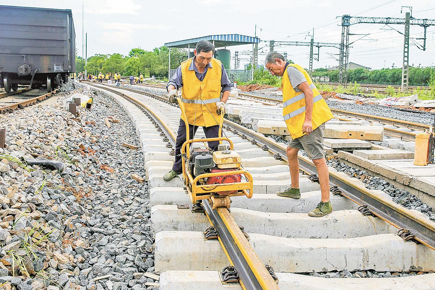 连日来,中铁七局建设者冒着高温进行铺轨作业施工。该工程为华中地区最大编组站——武汉北站5场扩能改造工程,在原有36股轨道基础上,新建12股轨道,并修建相关水沟及安装减速器、减速顶、停车器等。由于新增12股轨道全部分布在原设计预留的既有线路中间,施工与调车作业相互影响,施工安全压力较大。项目部克服诸多困难,进行全力冲刺。