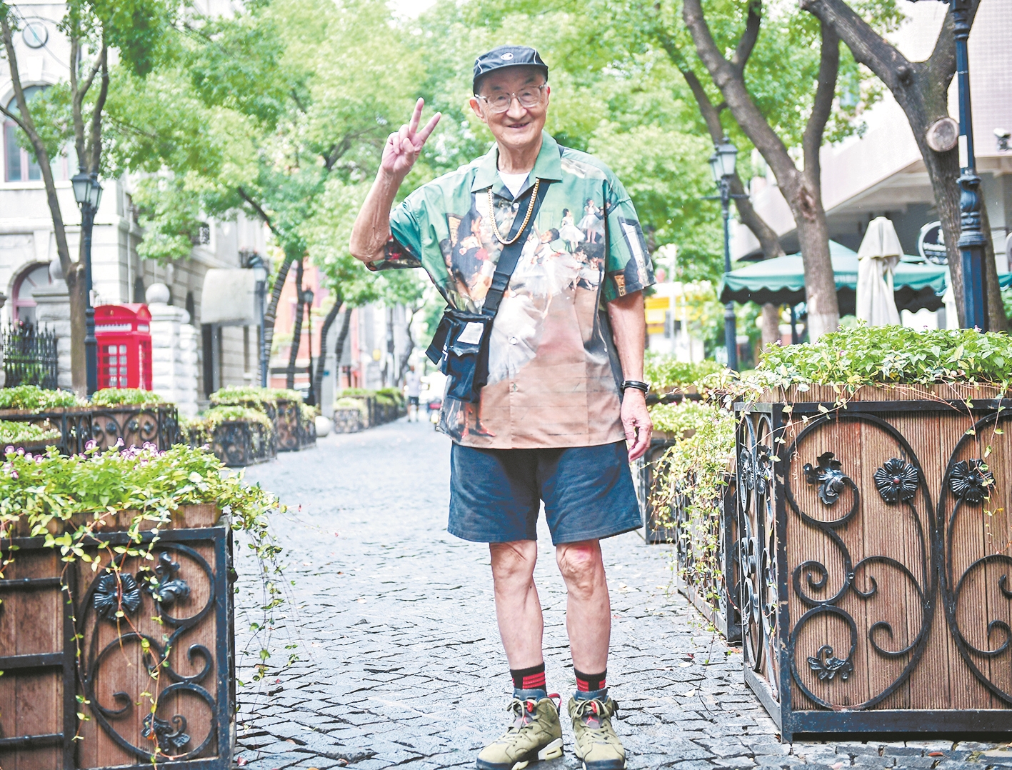近1.8米的高个,身穿印着油画的浅绿色衬衫,脖上挂着明晃晃的“大金链”,脚踩一双限量版的AJ6篮球鞋,斜挎着黑色的潮牌包包……只看背影,你可能以为这是一位穿搭时髦的花样潮男,等他转身你才会发现,这是一位笑容可掬的老爷爷(如图)。
