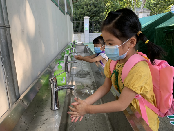 当天,每位孩子在一名家长的带领下,根据提示进入测温登记处,确认体温正常后再依次洗手消毒、进入班级。在班级里,他们翻开老师准备好的书本,很兴奋。