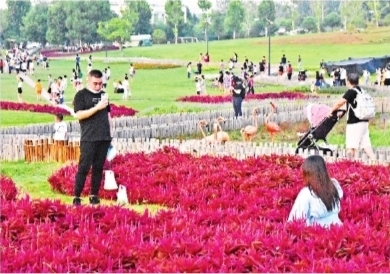 在花博汇,大片的向日葵、三角梅、紫薇花、硫华菊、鸡冠花等花卉盛开的美景引得游客不停合影留念。来自湖北黄冈的王先生称赞:“花博汇的花卉种类很多,好多都是第一次见,景色很美,今年国庆还会带着家人再来一次。”