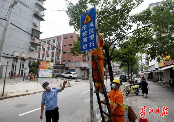 长江网8月30日讯全市中小学秋季开学在即。近一周来,汉阳区交通大队对辖区内44所临街中小学、幼儿园周边的交通设施进行逐一排查,先后对12处人行横道、黄色网格线、减速震荡线进行复线,在9所学校周边增设维护交通指示标牌,确保学校周边交通设施齐全有效、清晰醒目,全力做好中小学校复学的交通护学工作。(记者史伟 通讯员揭峰 黄伟 摄影报道)