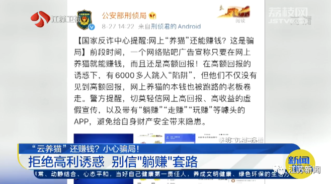 针对“网上养猫”骗局,@公安部刑侦局 发布微博称,国家反诈中心发出提醒:切莫相信网上高回报、高收益的虚假宣传,以及带有“躺赚”“走赚”“玩赚”等噱头的APP,避免给自身财产带来隐患。
