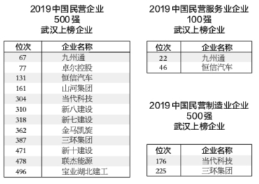 拥有一定数量的知名企业和优秀企业家,是一个城市综合实力的体现。2019年,我市入围中国民营企业500强企业12家,在全国15个副省级城市中位居第五,在湖北省民营企业100强占有63席。在企业发展壮大的同时,一批民营企业掌门人迅速成长,茅永红、黄立分别当选全国工商联副主席;2018年11月1日,黄立、阎志光荣出席全国民营企业家座谈会;同年,茅永红、郑举选荣获国家百名“改革先锋”称号,茅永红、黄立、阎志入选中央统战部、全国工商联“改革开放40年百名杰出民营企业家”;今年7月21日,黄立光荣出席了全国企业家座谈会,并代表全国民营企业家发言,树立了武汉企业家的良好形象。