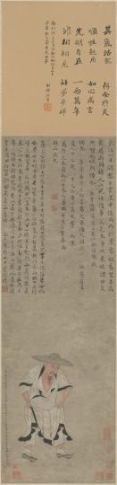 而明代画家朱之蕃《临李公麟画苏轼像轴》系近些年来首次面世,“上次展出可追溯到民国时期”,郁文韬说。画像内容系苏轼晚年被贬海南时,在访友途中遇雨,他向农人借来斗笠和木屐,农人争相笑看,而苏轼坦然处之。此图表现苏轼身处逆境而安之若素的生活态度,此类笠屐像也成为后世在描绘苏轼形象时的一种经典范式。