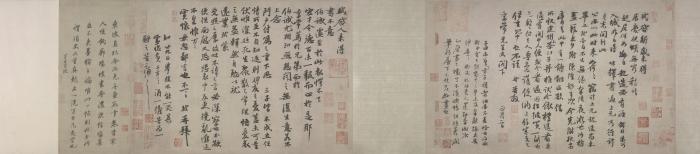 《新岁展庆帖》和《人来得书帖》则是苏轼写给陈慥(字季常)的书札。二帖自然流畅,姿态横生,秀逸劲健,是苏轼书法由早年步入中年的佳作。