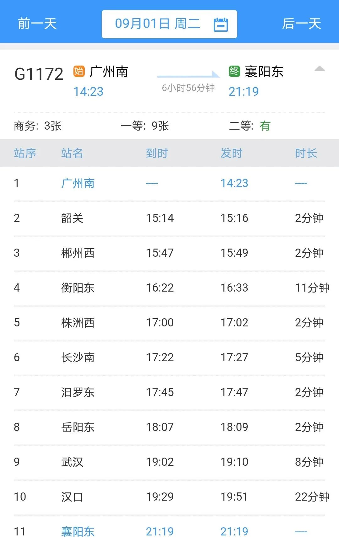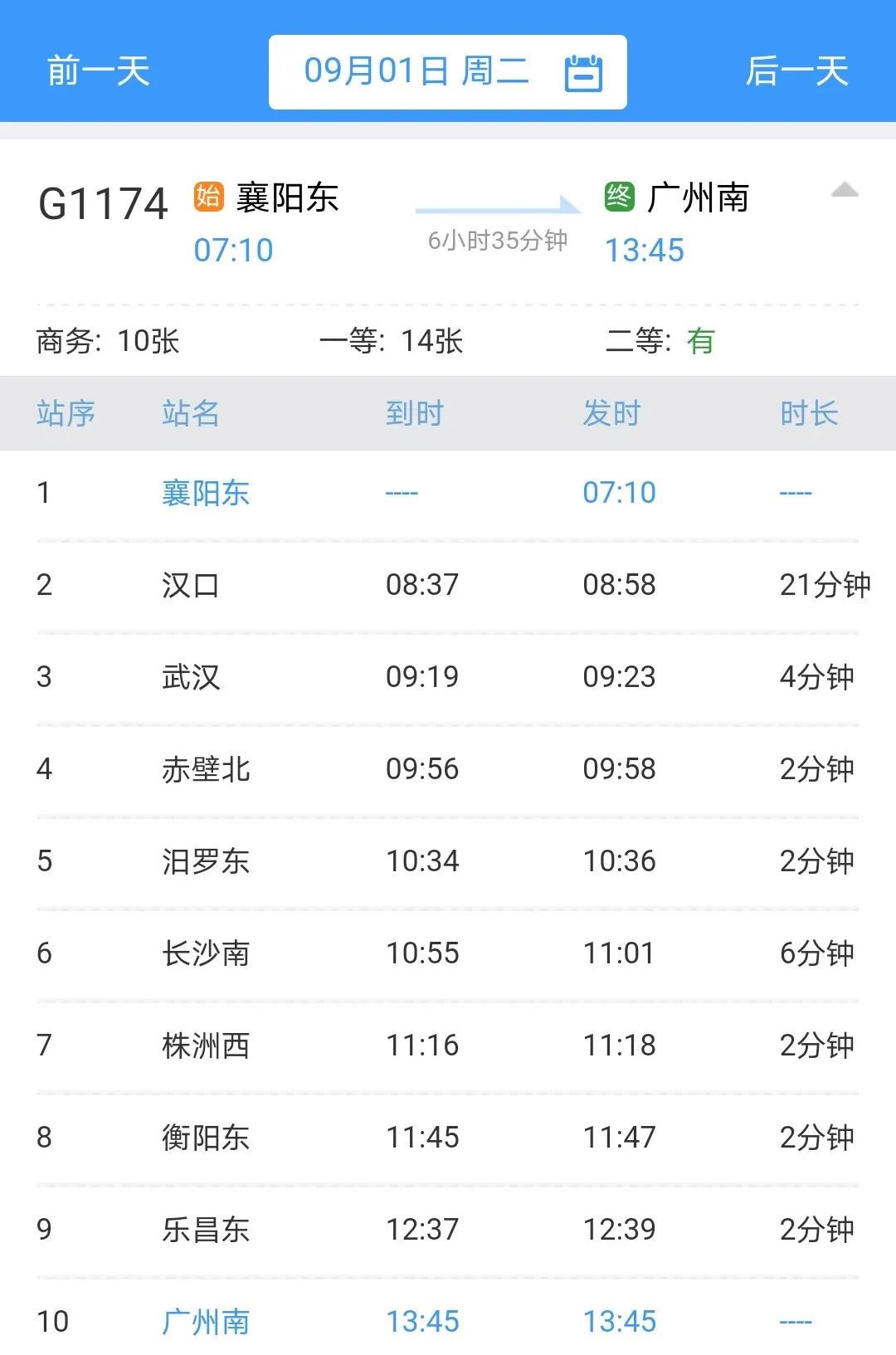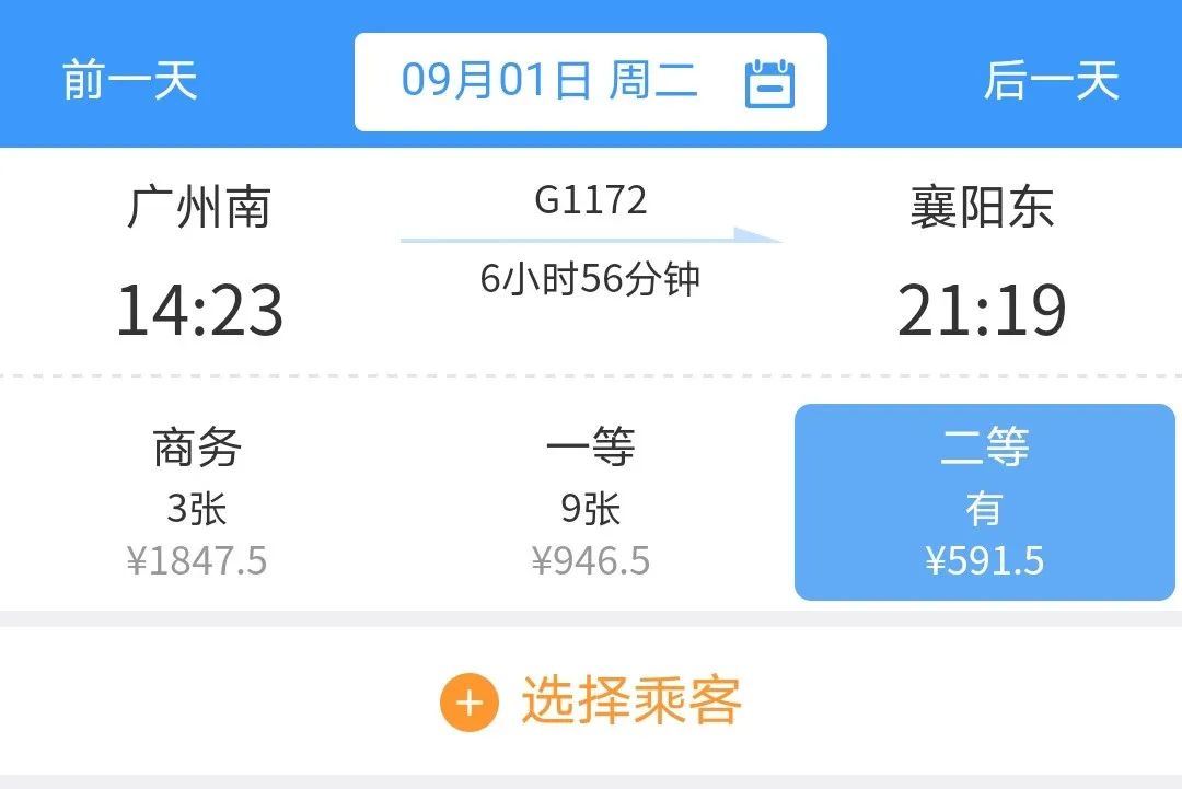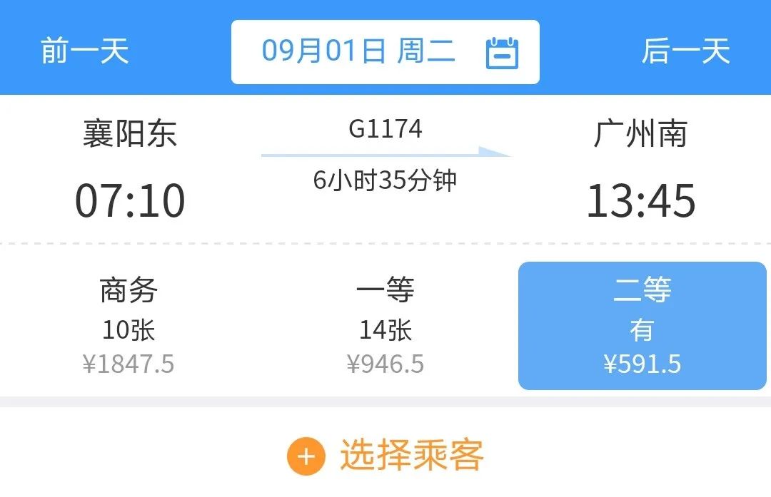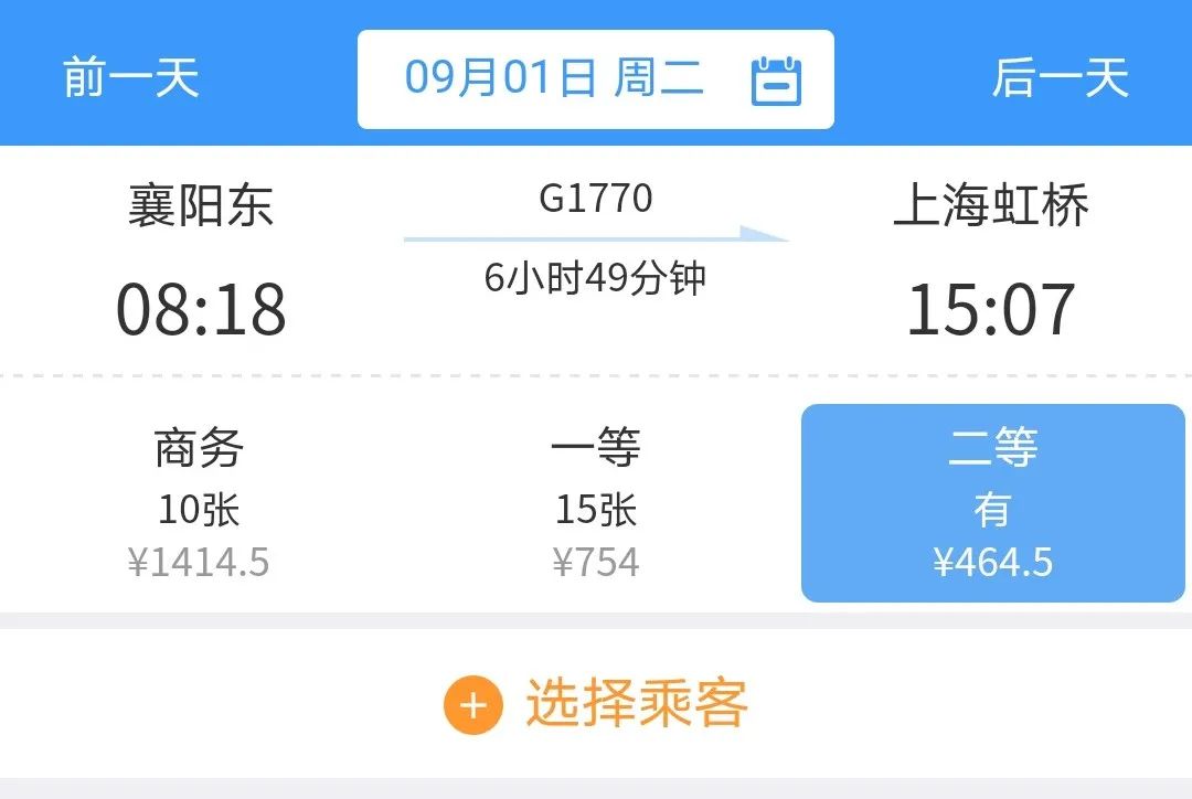 已经可以购买9月1日从襄阳东往返广州南、上海虹桥的高铁车票。