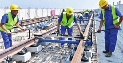 8月31日,地铁16号线川江池站至沌口站高架段,工人正在架设轨排、调整轨距。记者李永刚 摄