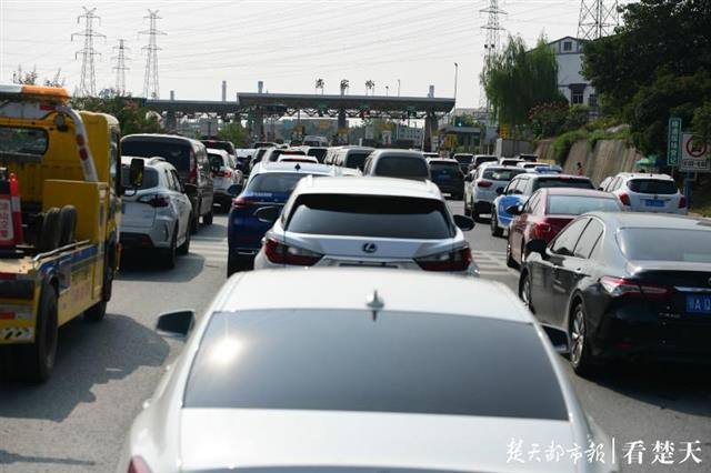 楚天都市报9月1日讯(记者刘闪 刘中灿 见习记者张奇)今天上午,武鄂高速龚家岭收费站入口处,等待出城的车辆排起了长队,拥堵超过1公里。记者探访看到,因临时施工封闭了其中一条通道,造成出城车流拥堵。