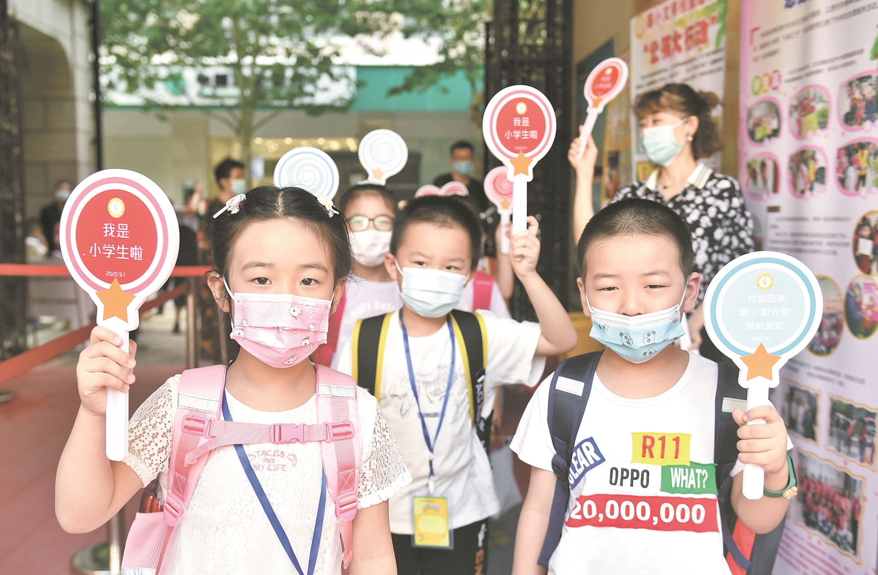 江岸区鄱阳街小学的同学们,入校时都收到学校准备的小牌子。新生的牌子上写着“我是小学生啦”,其他年级学生的牌子上写着“欢迎回家”等字样。
