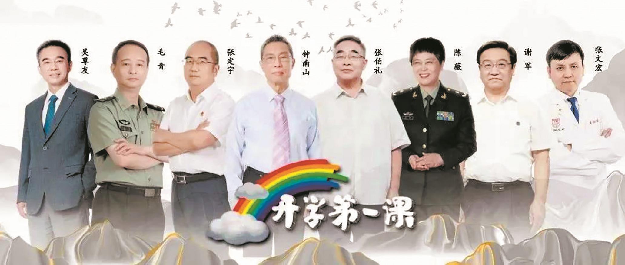 在2020年《开学第一课》的课堂上,钟南山结合个人成长经历和真实感悟,讲述自己在战火中出生、在父母影响下学医从医、在“非典”时挺身而出,以及在新冠疫情发生时奔赴武汉一线的故事,激励年轻一代热爱生命、敢于担当。