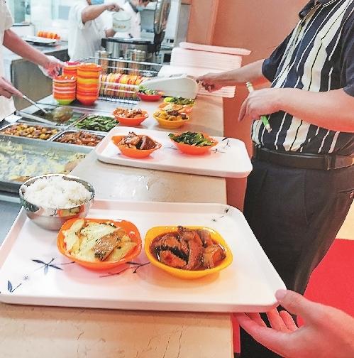在服务窗口,每天有8个不同的菜品可供选择。汪敬东介绍,每个就餐者米饭预定为二两,如果不够,吃完了可以再加。“以前我们执行的是标准餐,每人三两饭,四菜一汤,每天更换品种。”汪敬东坦言,这样的配餐采购和烹饪十分方便,但是标准餐里面的菜品一样,因为大家口味不同导致很多人剩菜,有些人饭量小也吃不完,一天下来泔水桶能装满好几桶。