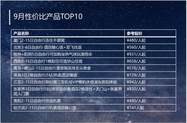 9月份去哪玩更划算?从自由行产品大数据看,“9月国内游十大最具性价比线路”包括国内的厦门、张家界、哈尔滨、西安、青岛+崂山、三亚、桂林+阳朔、北京、贵阳、珠海。记者通过app查询发现,携程推出包含这些目的地在内的热门线路往返机票+酒店打包自由行产品,最低价大都在600至700多元。比如,9月22日武汉出发前往厦门和鼓浪屿的3-15日自由行产品,最低价格为683元/人,9月16日和19日最低为七百多元。武汉出发前往广州的2-15日自由行,9月11日最低价格为657元/人。而9月15日从武汉出发到北京的2-15日自由行,最低价格仅为569元/人。