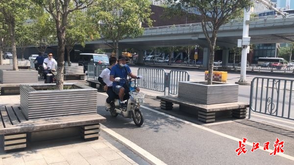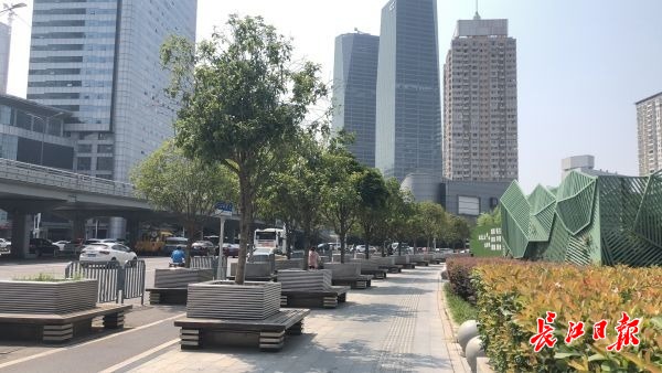 9月1日,记者来到青年路王家墩地铁站路段。记者统计,该路段共有21个1米见方的树箱,每个树箱外都围了一圈座板,箱内的树木虽然个头不大,但树冠刚好能覆盖一米半径的范围。记者看到,一位市民路过此处,坐在座板上。
