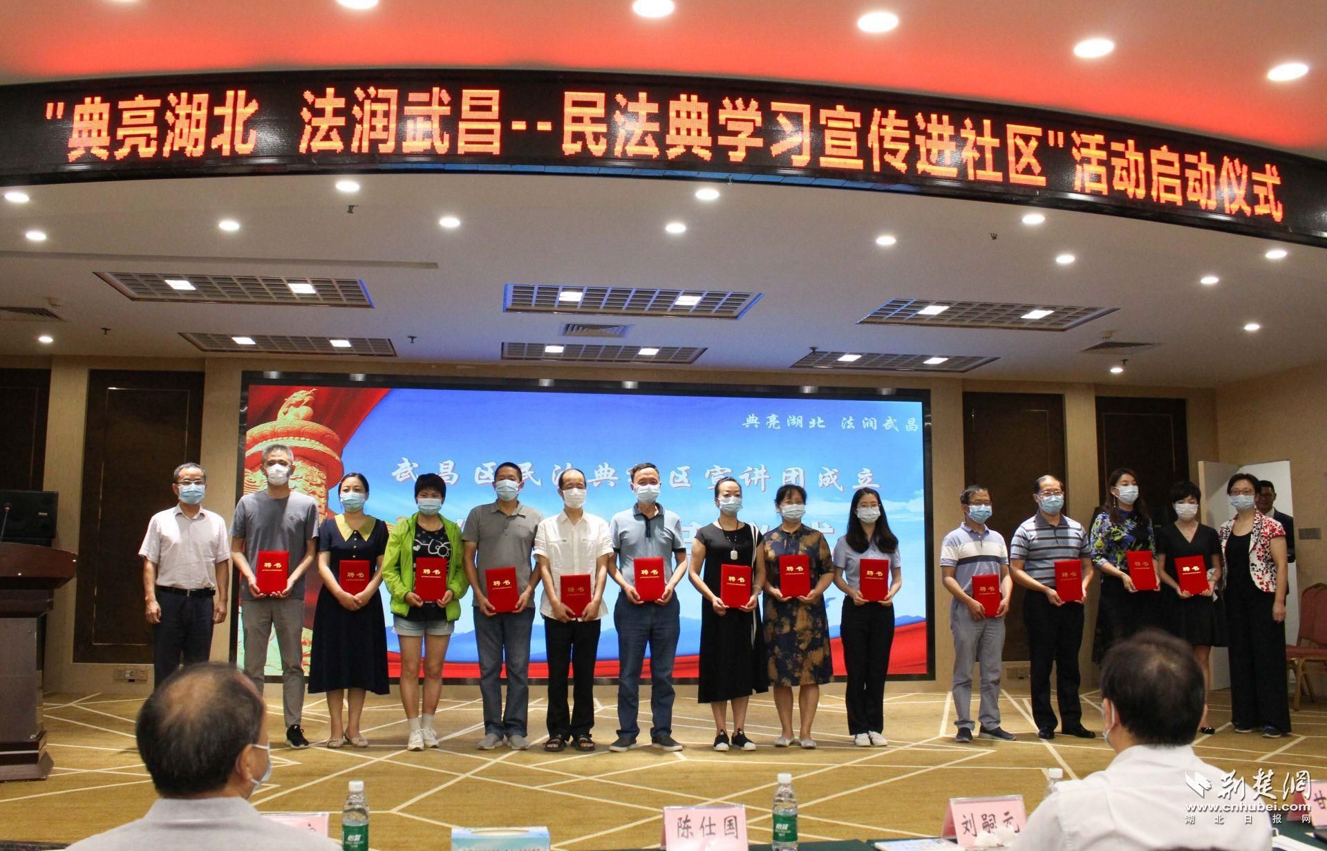 活动现场,省普法办向武昌区赠送了230套《民法典宣传挂图》,武汉市司法局、武昌区司法局有关负责人向14个街道的民法典社区宣讲团颁发了聘书。