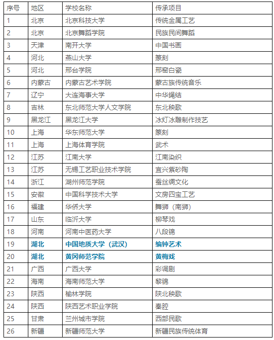 为深入推进中华优秀传统文化全方位融入高校教育,教育部决定在全国普通高校开展中华优秀传统文化传承基地建设,支持高校围绕民族民间音乐、民族民间美术、民族民间舞蹈、戏剧、戏曲、曲艺、传统手工技艺和民族传统体育等传统文化项目建设传承基地。