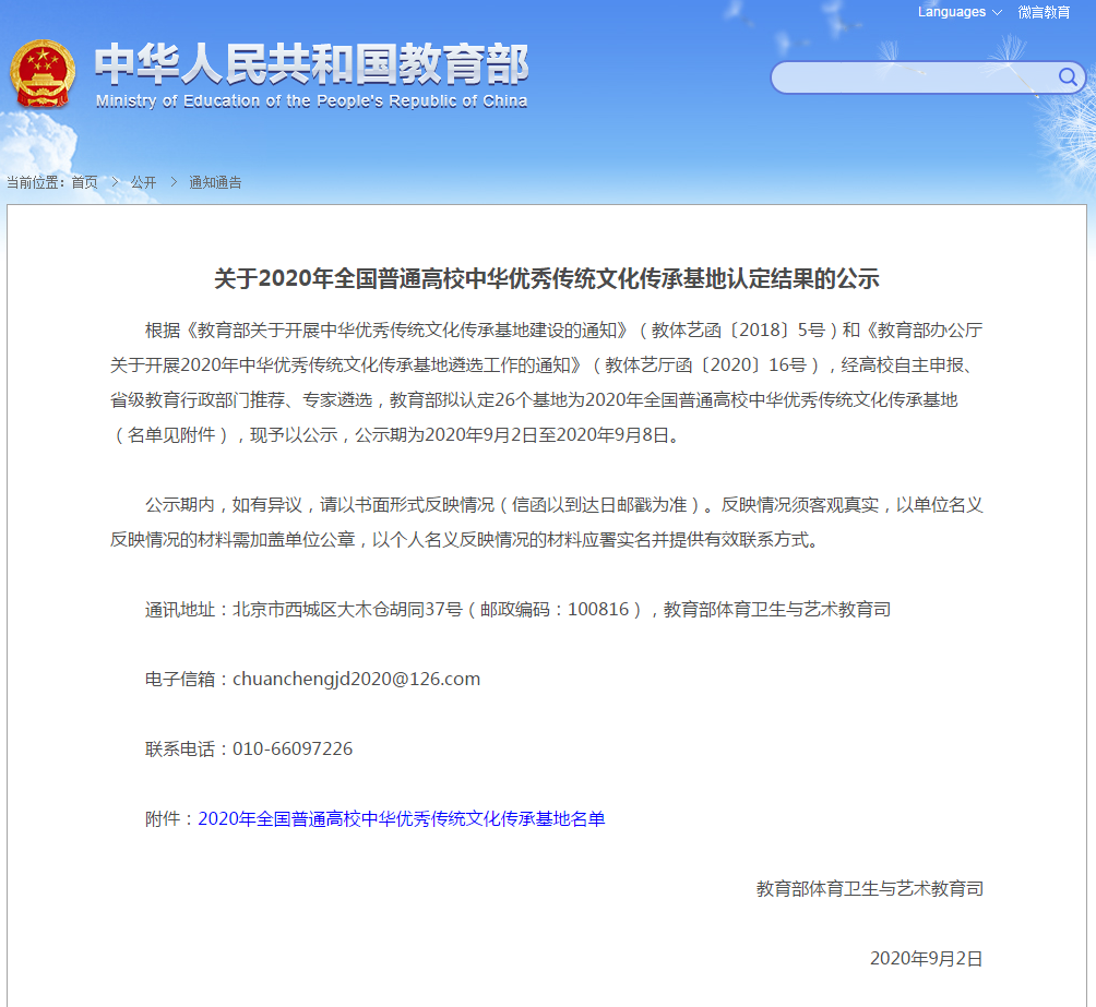 9月2日,教育部发布了《关于2020年全国普通高校中华优秀传统文化传承基地认定结果的公示》,经高校自主申报、省级教育行政部门推荐、专家遴选,教育部拟认定26个基地为2020年全国普通高校中华优秀传统文化传承基地。中国地质大学(武汉)和黄冈师范学院榜上有名!