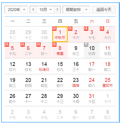 10月1日(星期四)至8日(星期四)放假调休,共8天。