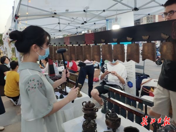 江夏青年文化节现场,工艺品展位前工作人员演奏编钟。 记者张奔设 摄