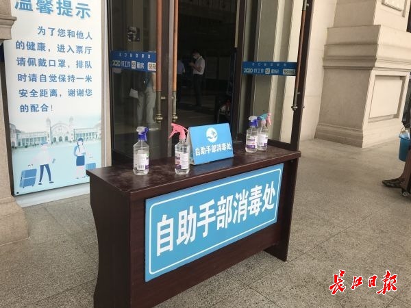 汉口火车站售票处提供消毒液。 记者王谦 摄