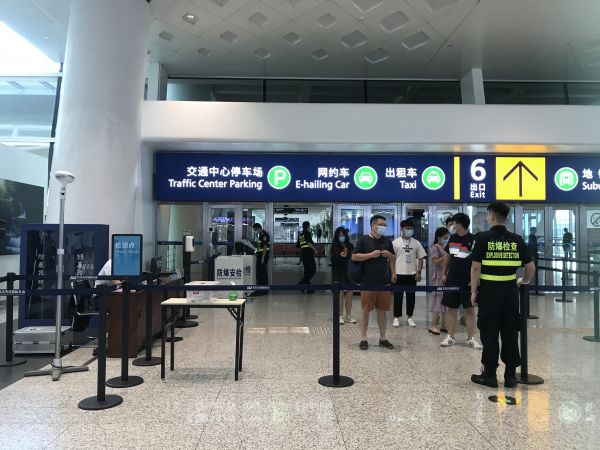 旅客扫码测温进入机场航站楼。 记者王谦 摄