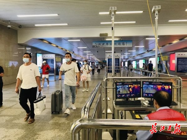 4日,长江网记者在汉口火车站广场看到,售票处门口摆放了消毒液供过往旅客使用;进站口处,工作人员手持测温仪一一检测旅客体温,并核查健康码;行李安检处也有数台红外测温仪对旅客再次测温。