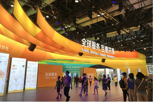 “全球服务,互惠共享”主题格外醒目。
