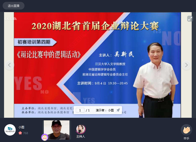阔别一周,9月4日19:30-20:45,由湖北省图书馆、省演讲协会、楚商联合会共同举办的e海悦读“知识为舟,共渡时艰”2020湖北首届企业辩论大赛培训第四期又在湖北省图书馆阅读直播间线上开讲啦!江汉大学人文学院教授,中国逻辑学学会会员、前湖北省论辩逻辑专业委员会主任吴新民老师奉上了《辩论比赛中的逻辑活动》。吴老师从逻辑与辩论的紧密联系、逻辑与辩论比赛中辩题的价值语句特征、辩题的译义与释义、辩论比赛中的其它逻辑活动思想的逻辑推演等几个方面对辩论中的逻辑进行了深度阐释。