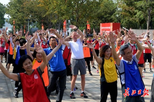 跨国公司高管们身着运动装,来到活动现场,在主持人的组织下,跳起健康操,挥动手臂、侧身击掌、扭动腰胯,现场气氛欢腾火热。