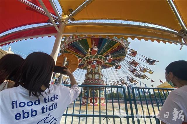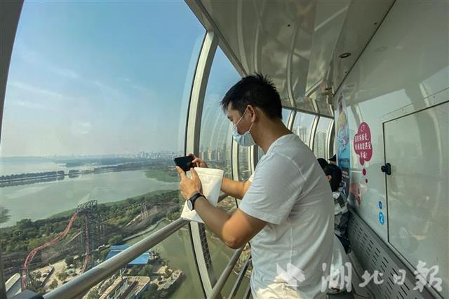 游客正在体验园内的旋转观光塔,从高空一览东湖及园区的风景。