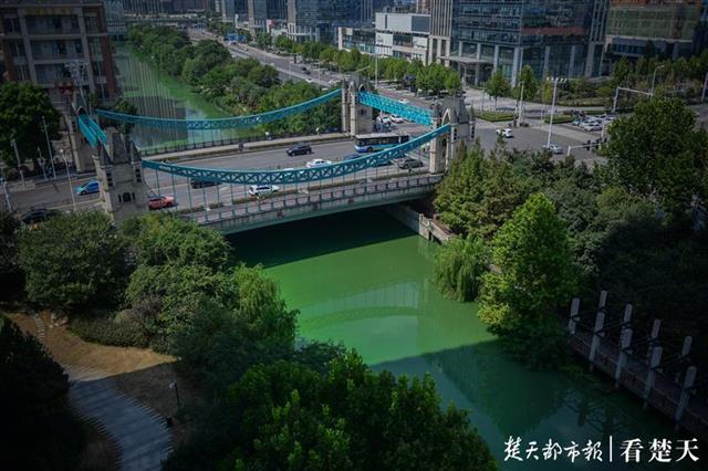 楚天都市报9月5日讯(记者陈倩 刘中灿)今日下午3时许,记者在武昌楚河边看到,楚河的大部分水面都被绿色颗粒状的漂浮物覆盖,河面如同刷上了“绿油漆”。