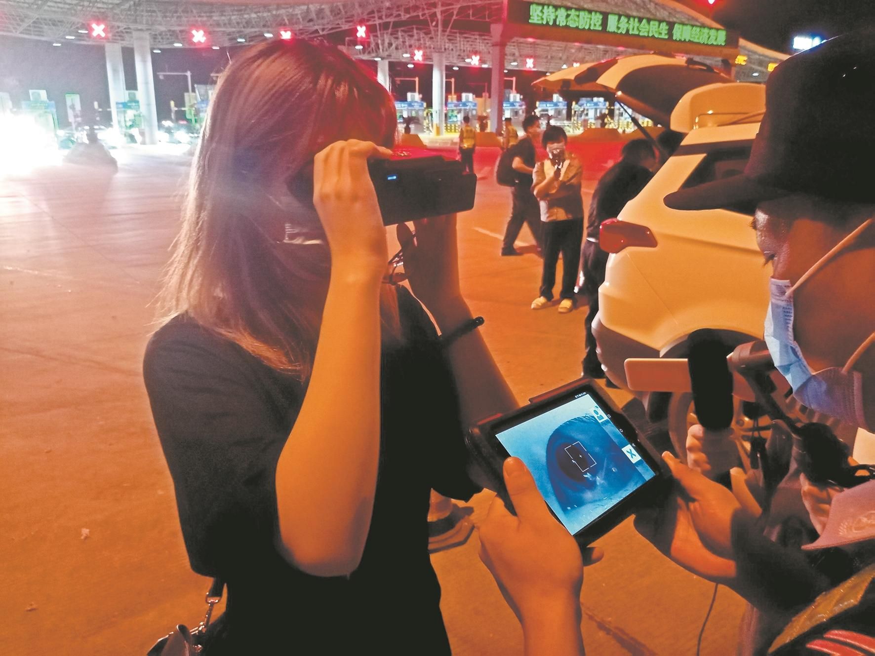 楚天都市报讯(记者吴昌华 通讯员张斌)武汉民警上路查缉毒品再添高科技利器。前晚,记者在查缉毒品现场看到,瞳孔检测仪可以根据瞳孔变化检测人员是否吸食毒品,而便携式X光探测仪则把一台X光探测设备“浓缩”到掌上,重量仅3公斤。