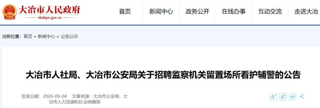 根据工作需要,大冶市人社局、大冶市公安局拟面向社会公开招聘60名监察机关留置场所看护辅警(其中,男48名,女12名)。现将有关招聘事项公告如下: