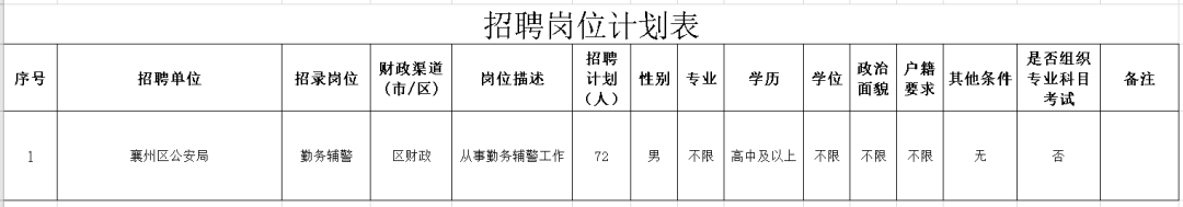 本次招聘警务辅助人员72名(男性)。具体招聘单位、招聘岗位、招聘人数及相关要求详见《招聘岗位计划表》