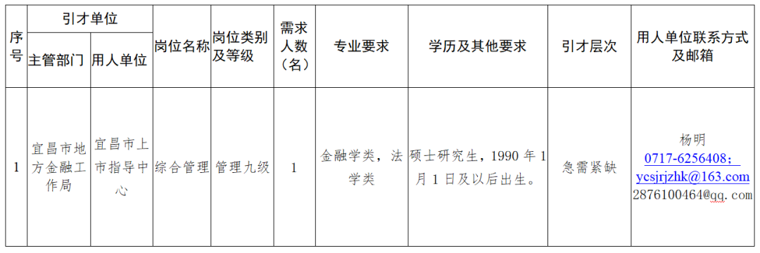 本次引进急需紧缺人才1名,涉及1个单位,1个岗位。