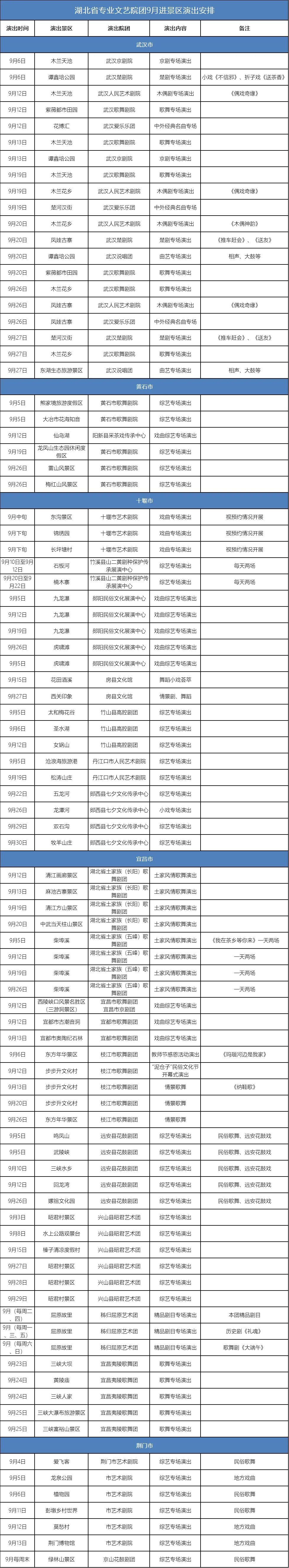 各专业文艺院团相继推出了展现中国梦时代主题、中华优秀传统文化、浓郁地域特色的剧节目和近年来获奖的剧节目,一批名家名角和“看家戏”参演,展现湖北舞台艺术魅力,使广大游客获得了丰富的观演和观景现场沉浸式艺术体验,9月份初步将安排340余场优秀文艺节目进景区演出。