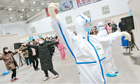 2月5日晚,首批3家方舱医院开始收治患者。图为2月10日,在武汉客厅方舱医院,医护人员带领患者们锻炼助康复。新华社发