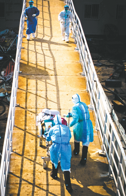 2月4日,武汉火神山医院接收首批新型冠状病毒感染的肺炎确诊患者。图为当日,医护人员将患者送入病房。新华社记者肖艺九 摄