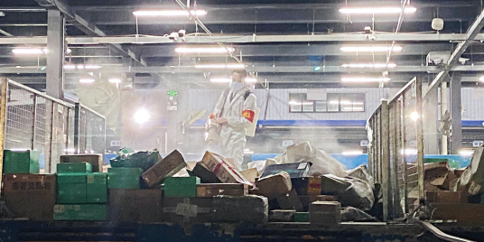 3月20日晚,中通快递武汉分拨中心,工作人员对包裹进行消毒。长江日报记者赵歆 摄
