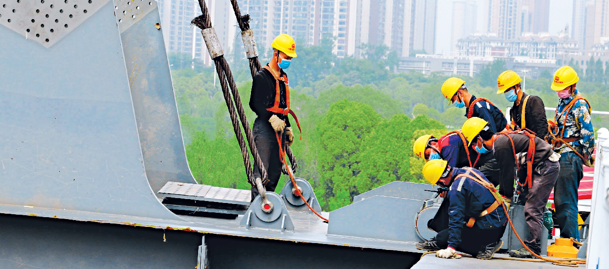 4月23日,江汉七桥主拱钢梁架设现场,5名工人系着安全绳,拉住缆绳,对系杆姿态进行调整,其他工人站在支架分配梁上,配合观测微调。长江日报记者杨涛 摄