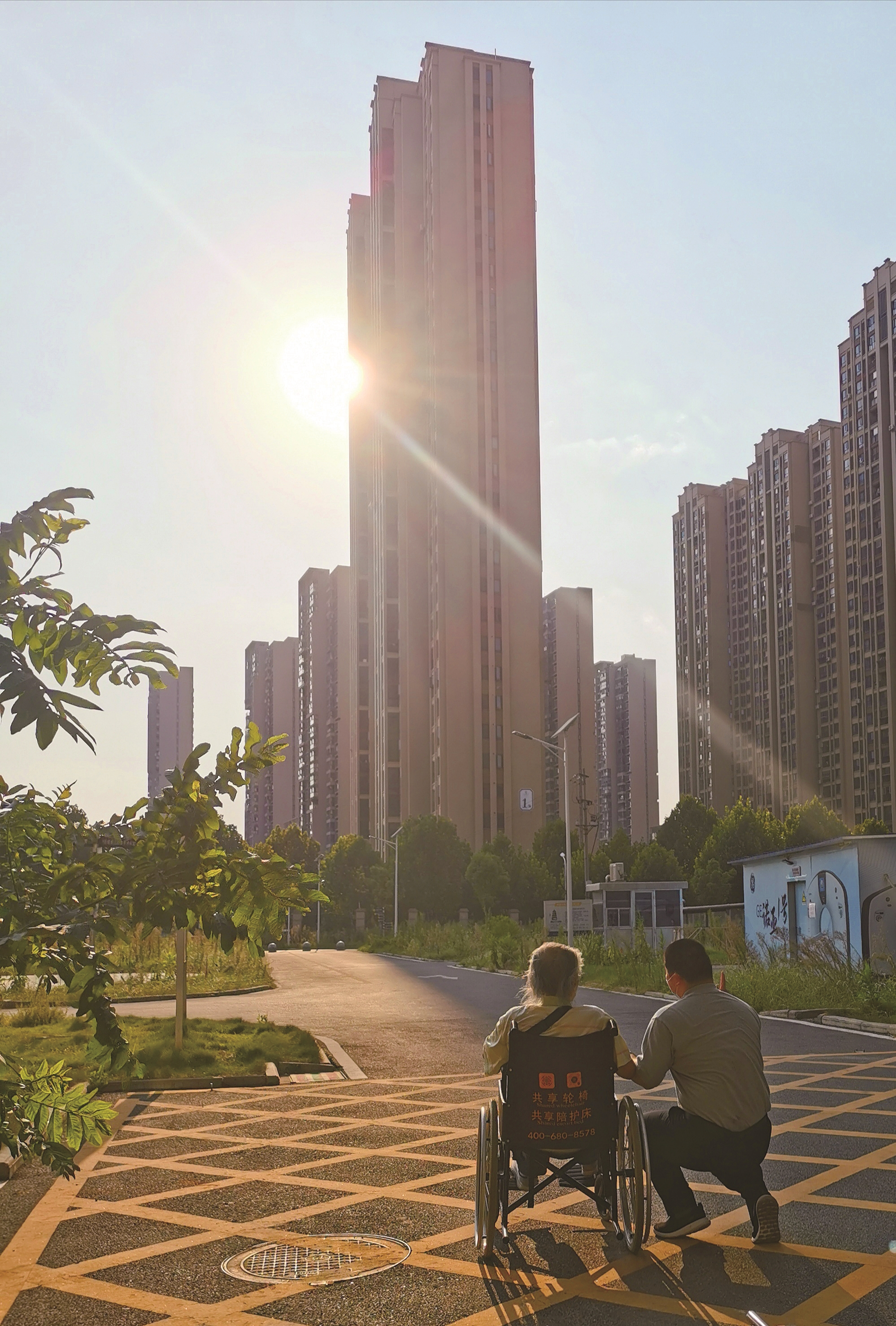 3月5日,在出病房做CT的途中,呼吸治疗师刘凯把病床停在医院大楼前,让王欣欣赏了久违的夕阳。
