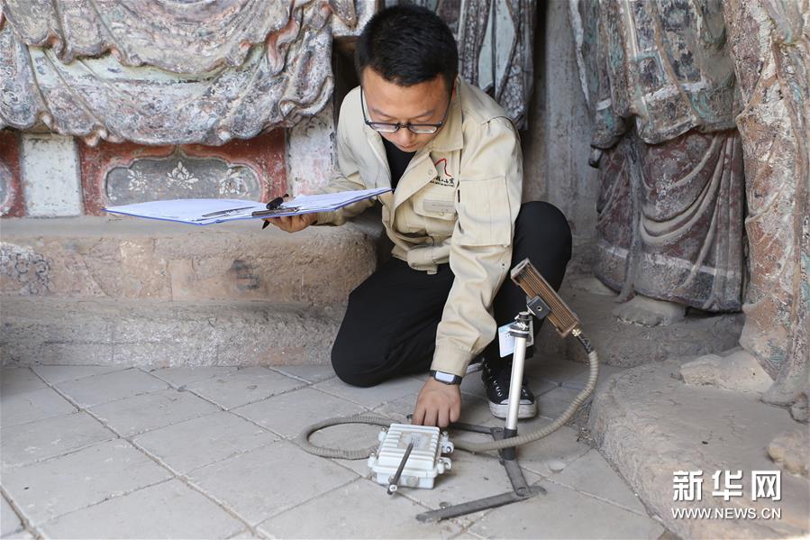 9月6日,在甘肃省天水市麦积山石窟,工作人员徐鹏在石窟内检查塑像倾角传感器。 新华社记者 耿馨宁 摄
