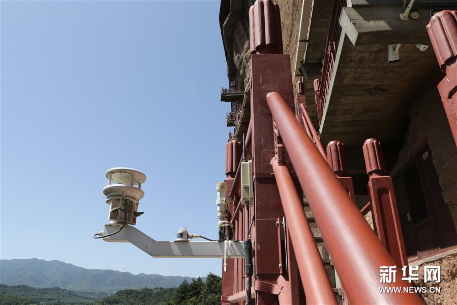 这是麦积山石窟栈道外侧的风向风速仪(9月6日摄)。 新华社记者 耿馨宁 摄