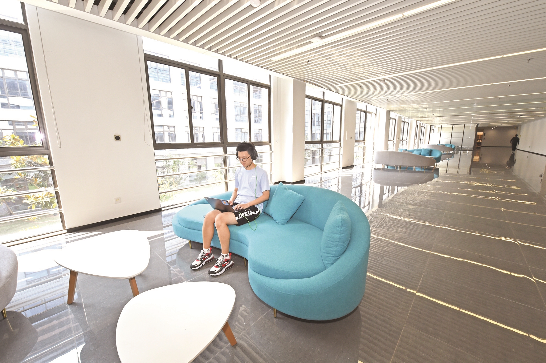 国家网络安全学院教学楼内,处处可见休闲现代的沙发、座椅,可供学生随时休息、讨论。