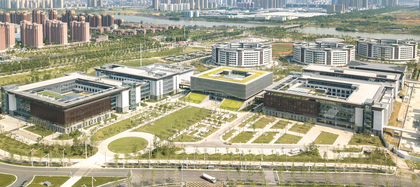 国家网络安全学院航拍图,近处方型建筑为教学楼和图书馆,远处圆型建筑为学生宿舍楼。