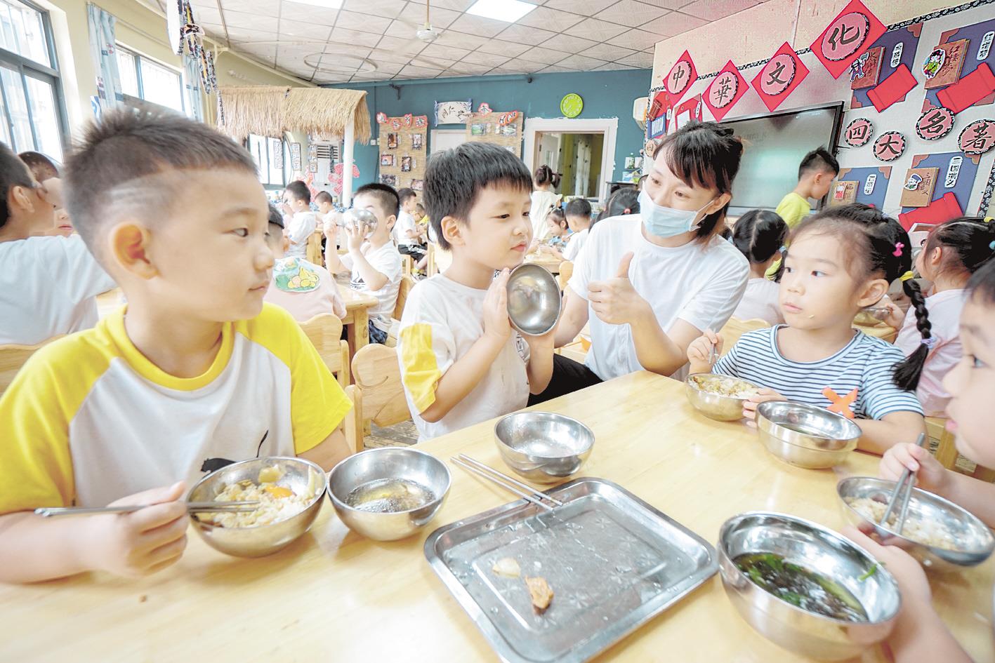 9月1日,省直机关第二幼儿园一位小朋友吃完饭,碗里不剩一粒米饭,得到教师大拇指点赞。 (湖北日报全媒记者 陈勇 通讯员 周保国 刘慧芹 摄)