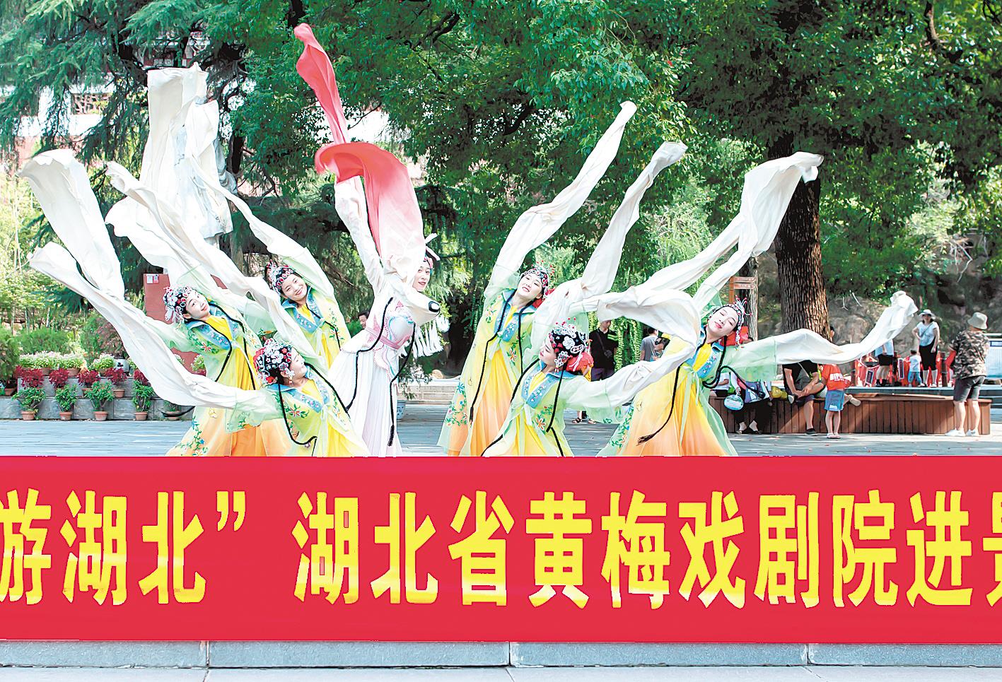 湖北日报讯 (记者王晶、通讯员鄂文旅)苏东坡塑像迎风而立,黄梅戏歌《情系遗爱湖》袅袅传来,大文豪与黄冈的故事,在黄冈赤壁公园里的二赋堂、留仙阁间流转。9月5日上午,湖北省黄梅戏剧院的演员们来到国家4A级景区赤壁公园,以山水为背景,为游客奉上浓郁黄梅戏风格的文艺节目。有游客拍照发了朋友圈,“原来,这里是黄梅戏的故乡。”