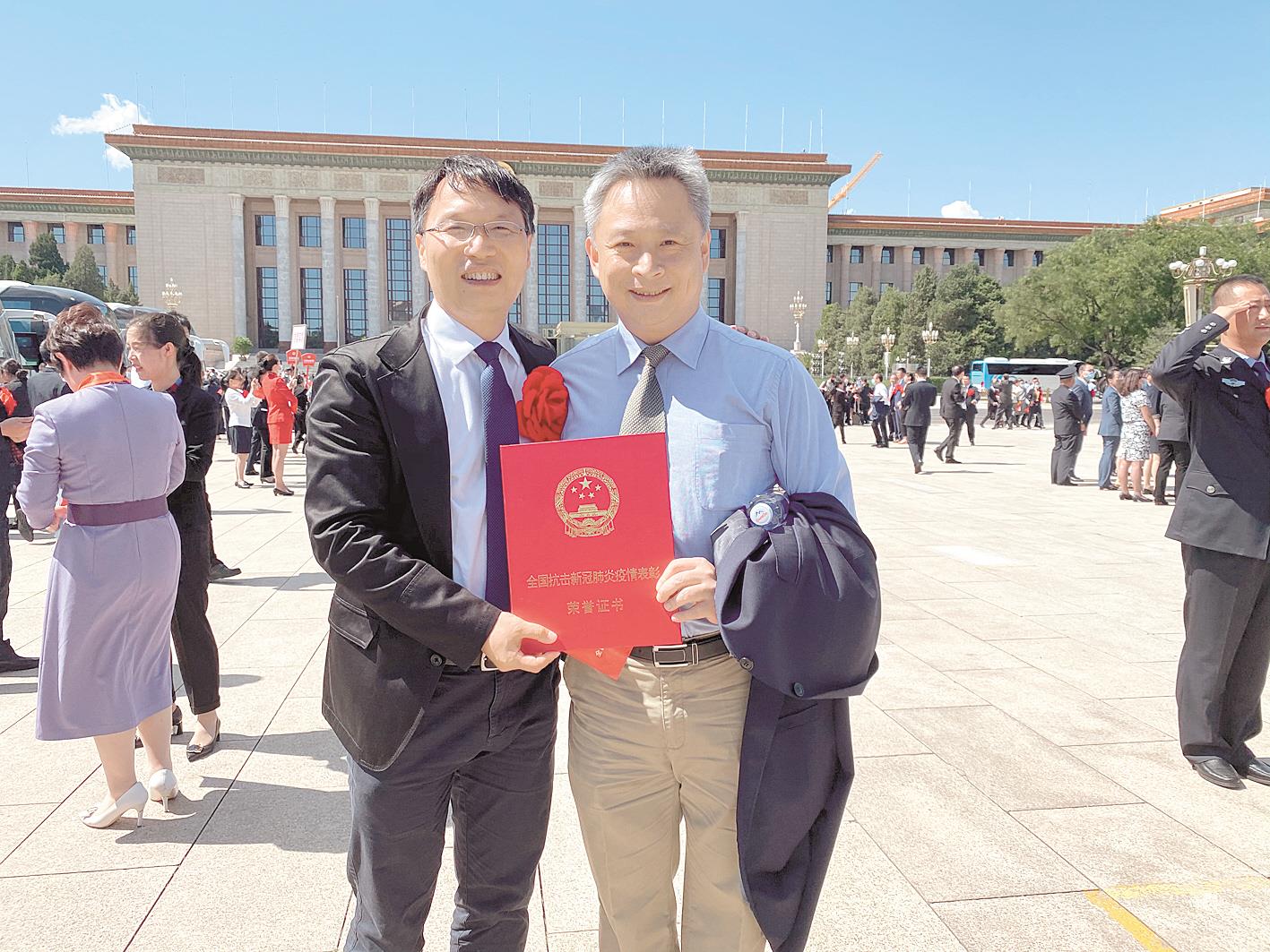 孙鹏给记者看了他们2月初的合影,彼时寒冬,两人都身着厚棉服,戴着口罩。再次合影的照片里,两人取下口罩,手捧荣誉证书,在人民大会堂前露出灿烂的笑容。