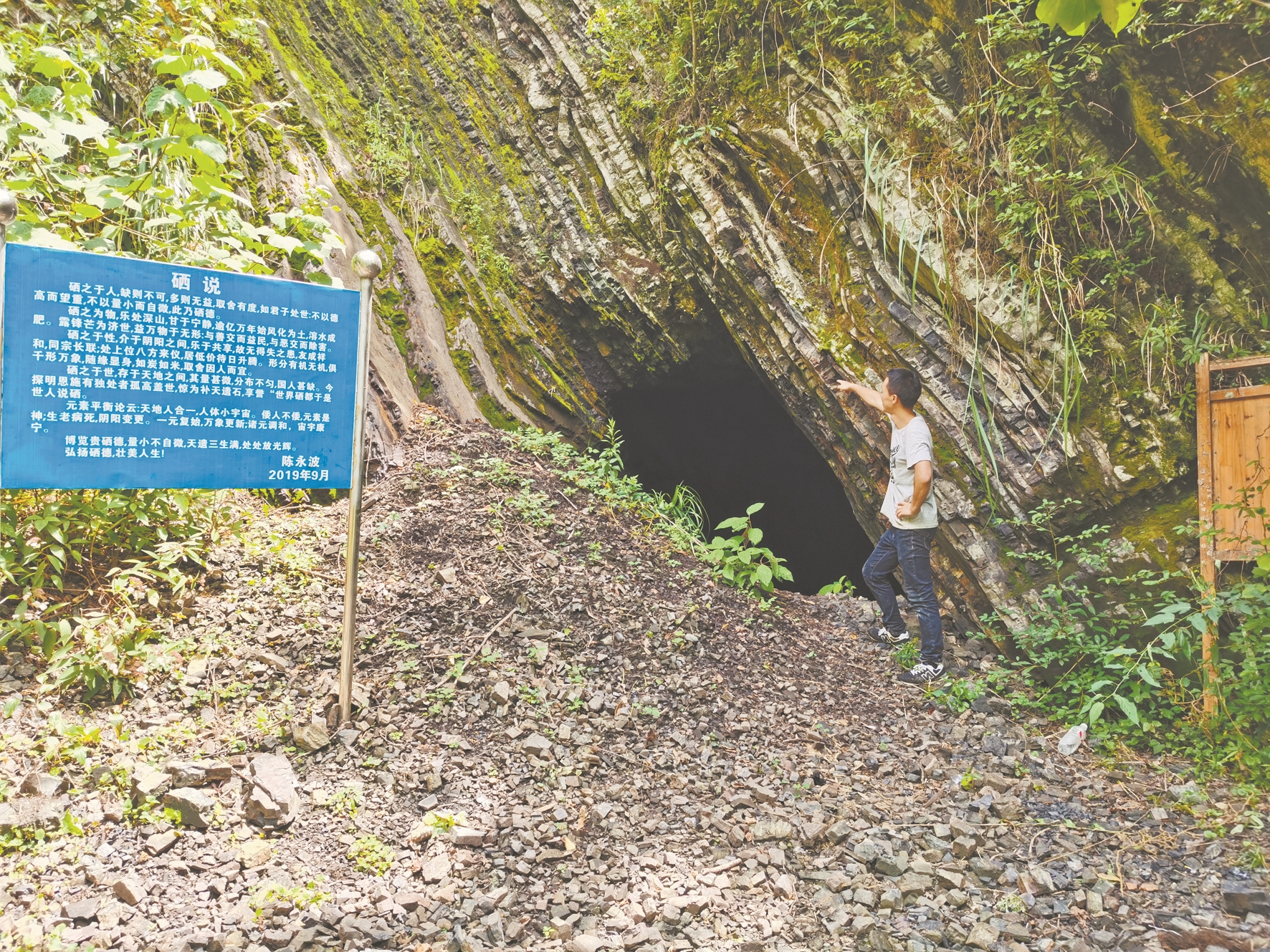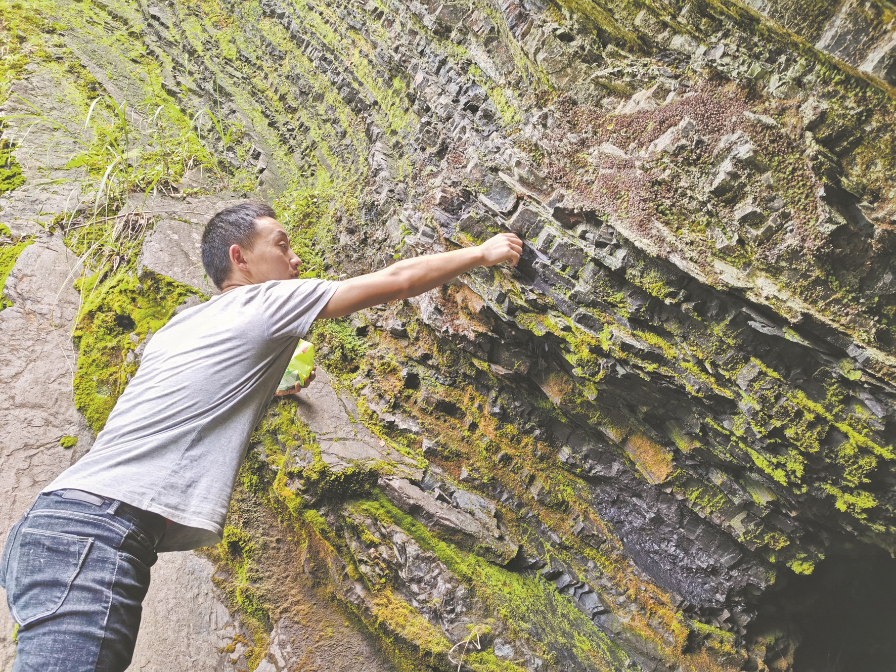 这是一个普通的岩洞,没有明显的标志。洞口不大,约一丈多高,外壁光滑,长着绿绿的青苔。洞深六七尺,黑黢黢全是黑色页岩,一层层好似积木。董世森说,这就是硒矿石,颜色越黑含硒量越大。只见他攀上岩壁,用手一抠,一块硒矿石就握在手中,用力揉搓粉末撒落。“带点回去撒一点点在土里,种的菜就是原生态富硒食品。”董世森说。