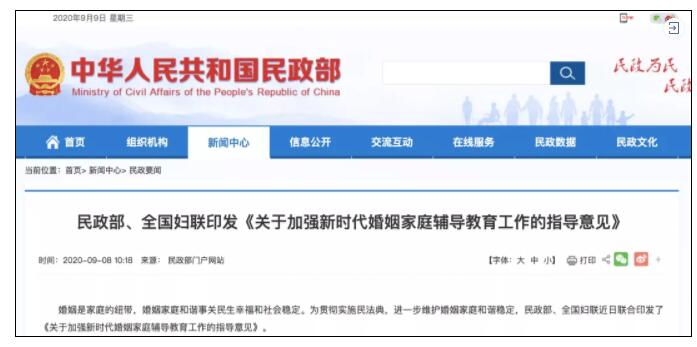 据民政部网站9月8日消息,民政部、全国妇联近日联合印发了《关于加强新时代婚姻家庭辅导教育工作的指导意见》(下称《意见》),提出探索开展婚前辅导,提升结婚颁证服务水平,建立地方领导、社会名人颁证制度等举措。